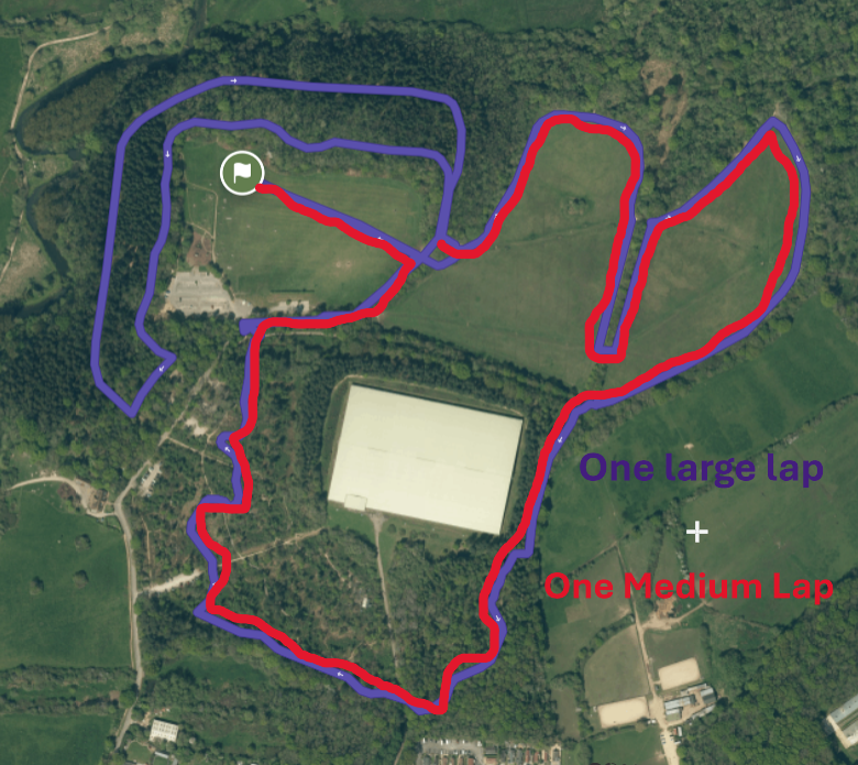 The course is approximately 4.7 miles long and a mixture of forest/woodland paths and grass. Some sections will be very muddy and trail shoes are definitely advised. The start and finish is at the flag on the map, and the route is one large loop (Purple) followed by 1 Medium loop (Red). Please listen to marshal instructions as there will be occasional areas that are narrow, or slippery.